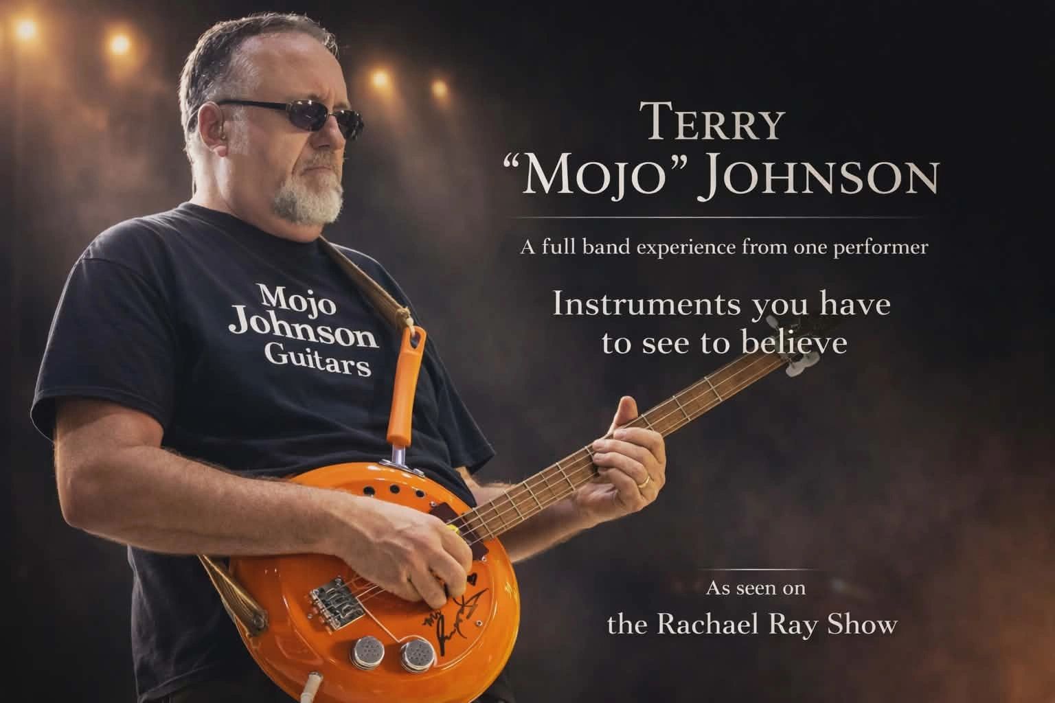 This is Terry Mojo Johnson. I've been entertaining audiences from schools to national tv shows and everyplace in between. I caught the eye of the Rachael Ray TV show with a guitar I made from one of her frying pans that ended with me playing on her show. I've been making and playing many different instruments professionally and one thing for sure everybody from young to old likes to hear me play them and hear the stories of how and why. Each instrument has a story. I have many viral instrumental videos on my band's Facebook page The Swamp Drivers. Many of the instruments were made from reclaimed items that some people would have thrown out, but I took these items, built instruments and make music that people from around the world buy my CD's. I make the show fun and entertaining.